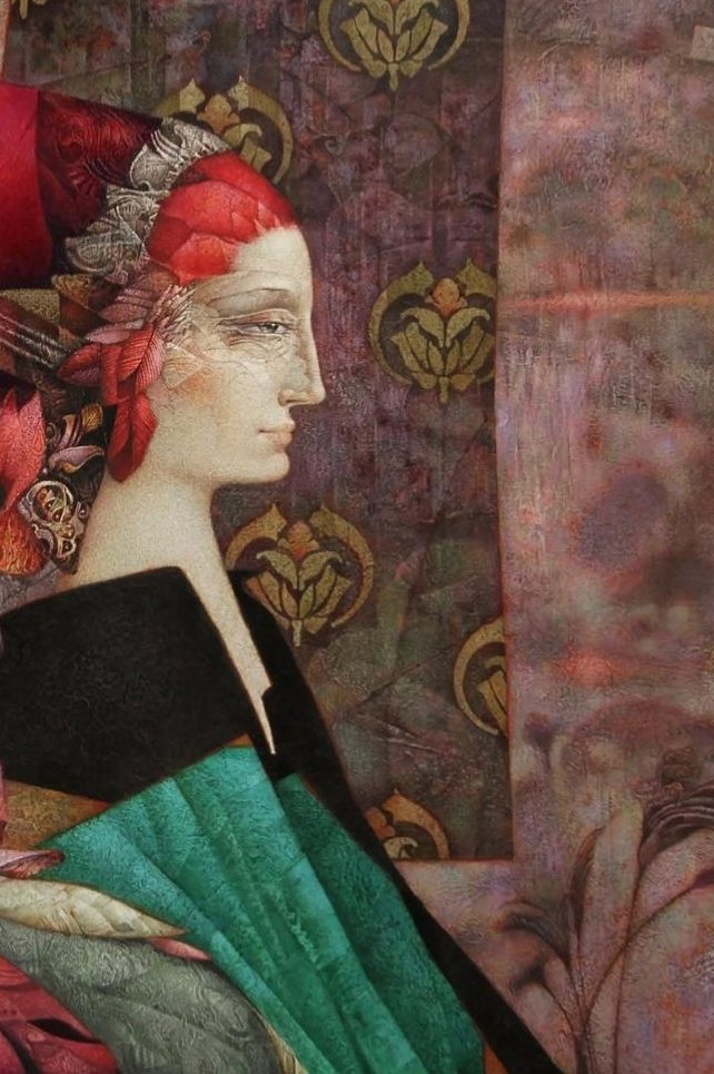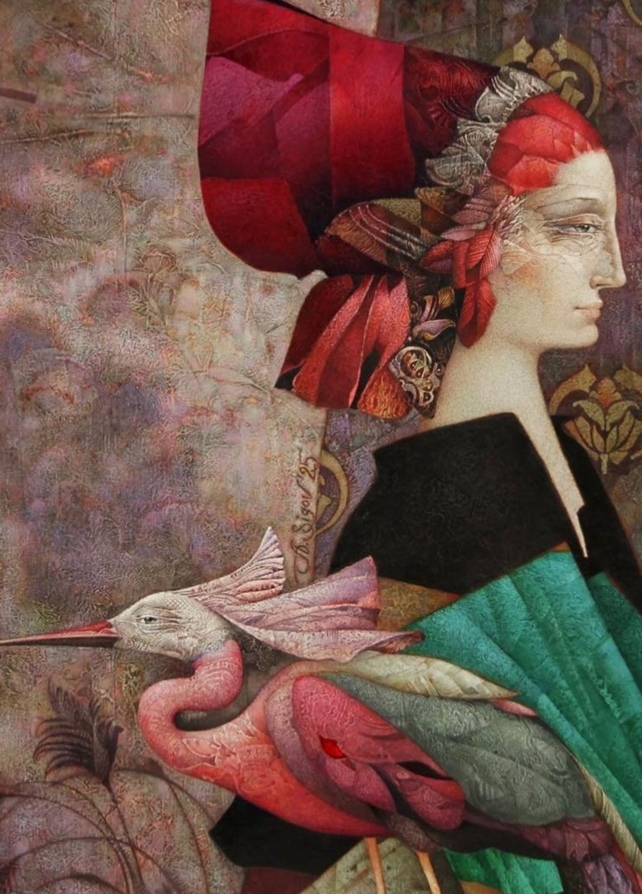 В художественном мире Александра Сигова образ всегда несет в себе культурный слой и символическое измерение. В «Диалоге» это особенно заметно. Женский профиль, птица, орнаментальная среда, сложная фактура и собранная цветовая гамма формируют пространство, в котором разговор происходит не только между персонажами или мотивами, но и между произведением и зрителем. Здесь все построено на тонкой взаимосвязи: фигура не отделена от фона, предметный мир не существует сам по себе, цвет не украшает, а удерживает состояние.